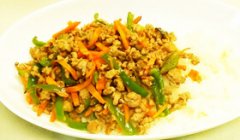 ピーマンとレタスの鶏そぼろ丼みそポン酢味