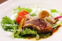 カツオのガーリックステーキ。 ガーリックオイルでカツオの表面に軽く火を通してステーキ風に!野菜と一緒にサラダ感覚でも美味しくいただけます^^ カツオのガーリックステーキ...