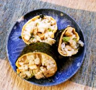 野沢菜と酒蒸し鶏の卵海苔巻き。