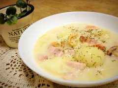 白菜とジャガイモのとろ~り豆乳スープ マッシュしたジャガイモに豆乳を加え、ジャガイモのとろ~りとしたスープ。白菜、ベーコンのうまみがよく合います。 白菜とジャガイモ...