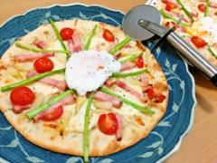 あさつきと温泉卵とアスパラベーコンのピザ