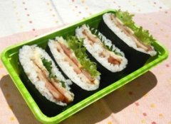 厚切りベーコンのおにぎらず お子様に人気のベーコンとチーズをおにぎらずにしました 大葉とレタスで風味の違いを楽しめます 厚切りベーコンのおにぎらず ごはん 海苔 カットベ...