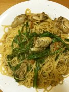 牡蠣と春菊のパスタ ペペロンチーノ ★超簡単★材料は和風だけど、仕上げは、白ワインとパルミジャーノチーズの純イタリア風! 牡蠣と春菊のパスタ ペペロンチーノ パスタ 牡蠣...