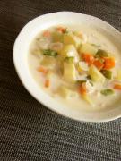 野菜たっぷりミルクスープ。 寒~い日はミルクスープで温まってくださいね。野菜がごろごろ(約550g)入った、食べるスープです。 材料 (4人分) さつま芋(中) 1/2本(約100...