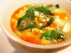 豆腐と卵、ニラの酸辣湯☆ あっと言う間に簡単サンラータン!寒い冬に是非☆体が温まります☆ 材料 (4人分) 豆腐 1丁 卵 3個 砂糖 小1 ニラ 1/2束 ☆水 800cc ☆ガラスープの素 大...
