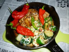 若鶏のもも肉とキュウリ+赤万願寺の炒め物
