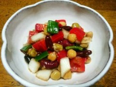 ミックスビーンズの塩麹マリネ 混ぜるだけの簡単レシピ♪ ミックスビーンズの塩麹マリネ ミックスビーンズ ピーマン 赤ピーマン 玉ねぎ オリーブオイル バルサミコ酢 塩麹 レモン...