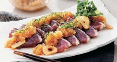 鰹のたたき きわみソースがけ 血液サラサラ♪生活習慣病の予防効果が期待できます☆ 材料 (2人分) 和風つゆ「きわみ」 1個 鰹のたたき(市販品) 180g 玉ねぎ 1/2個 酢 大さじ1 にん...