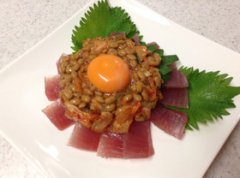 ♥簡単おつまみ♪マグロのキムチ納豆がけ マグロの冊を切るだけ~。混ぜるだけ~の簡単おつまみ♪ 材料 まぐろ 1冊 納豆 1パック キムチ 適量(お好みで) 卵黄 1個分 大葉 適宜...