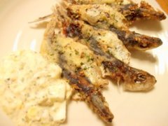 カリカリみじゅん☆山葵タルタルソース添え オリーブオイルで頭から尻尾までカリッと揚げたみじゅん(いわし)に特性タルタルソースをたっぷりかけて召し上がれ! 材料 いわし(...