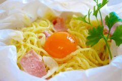友加里×地養卵★焼きそばカルボナーラ 電子レンジとクッキングシートで、フライパン不要!!超お手軽レシピです! 友加里×地養卵★焼きそばカルボナーラ 卵黄 ベーコン 玉ねぎ...