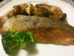 鮭のソテー舞茸玉葱赤ワインソース