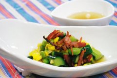 とうもろこしと枝豆の豆々サラダ 夏野菜のとうもろこし、枝豆、きゅうりを使ったスパイシーなサラダです ベーコンがアクセントに 料理研究家 行長万里 とうもろこしと枝豆の豆...