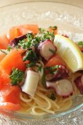 たこの冷製パスタ 簡単にできる冷製パスタです。 緑と赤の色とにんにくの香りで食欲も出て夏にぴったりです♪ たこの冷製パスタ パスタ たこ 大葉 トマト すりおろしにんにく オ...