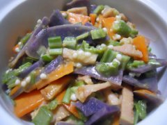 シャドークイーンとオクラの炒め和え 紫色のジャガイモ(シャドークイーン)の野菜炒めにオクラを和えた一品です。 シャドークイーンとオクラの炒め和え じゃが芋(自家栽培ま...