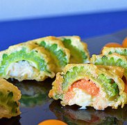 ゴーヤの天ぷら ☆ しらす・明太子入り 生春巻きの皮を使うのがポイントなの~♪ ゴーヤの天ぷら ☆ しらす・明太子入り ゴーヤ カマンベールチーズ しらす 明太子 生春巻の皮 天...