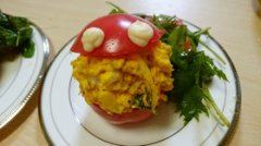 ハロウィン♪簡単!かぼちゃのおばけサラダ 簡単♪甘めのかぼちゃサラダをトマトに詰めておばけ風に! みんなでわいわいパーティーにもおすすめ♪ ワインにも合います♪ ハロウ...