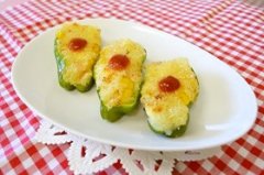 ピーマンボートの焼きポテト 半分に切ったピーマンにマッシュポテトと具を混ぜて詰めて焼きます。見た目もかわいくカルシウムもたっぷりの1品です ピーマンボートの焼きポテ...