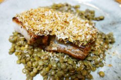 豚バラブロックのパン粉焼き、レンズ豆添え