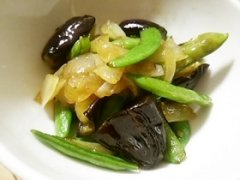絹さやと茄子と新玉ねぎの焼き肉のたれ炒め