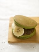 抹茶のフルーツどら焼き 大豆粉と米粉のパンケーキミックスで作るミニどら焼きです。いちごやアンズなど好みのフルーツでアレンジしても美味しいです。 材料 (直径8㎝のどら焼...