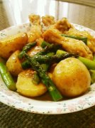 新じゃが・アスパラ・鶏肉の味噌バター 味噌バターでまろやかな味付けの煮物です☆ 新じゃががホクホクで美味しいです♡ 材料 (2人分) 新じゃがいも(小さめ) 3個 鶏肉(手羽元...