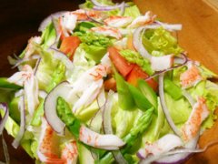 アスパラとカニカマの野菜サラダ♪ レンジでチンしたアスパラをサラダに♪ アスパラとカニカマの野菜サラダ♪ レタスの葉 アスパラガス きゅうり トマト 紫玉ねぎ かにかまぼこ...
