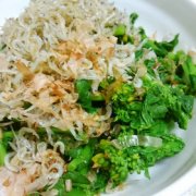 菜の花とカリカリしらすのポン酢がけ。 ごま油でカリカリに炒めたしらすを、茹でた菜の花に鰹節とともに盛り、ポン酢をかけて頂きます。しらす独特の匂いはありません。 菜の...