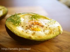 アボカドエッグボート(基本) 二つ割りにしたアボカドをくり抜き卵を入れて焼いたもの。半熟の黄身とアボカドのまったり感がおいしい!熱々で召し上がれ* アボカドエッグボ...