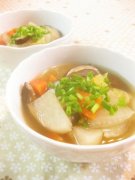 オッサンの和風コンソメスープ 鍋の残り野菜や、冷蔵庫に少しだけ余った野菜等あれば、コンソメ+白ダシでスープの具材に☆ オッサンの和風コンソメスープ 大根 人参 白菜 椎茸...
