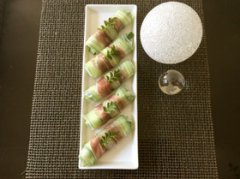 スライサーきゅうりと生ハムの生春巻き♪ ソースが絡みやすいようにきゅうりをスライサーで薄くカット☆お野菜をおいしく食べれるメニューです꒰ ¨̮͚ ꒱♩♩◦. 材料 生春巻...