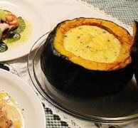 ハロウィンに☆南瓜のまるごとグラタン 南瓜をレンジで茹でてから種を取り、具材を詰めてオーブンで焼きました。Xmasパーティーにもお勧めです。 ゆうゆう0221 材料 (4人分) 南...
