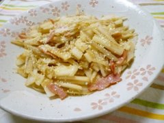 長芋ベーコンごぼうのバター炒め 長芋の程よくシャキシャキした食感とバターの香ばしさが美味しいオススメおかずです。上からかける粉チーズが決め手☆ 長芋ベーコンごぼうの...