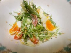 水菜のサラダ 簡単 今が旬の冬野菜水菜をサラダで簡単に美味しく出来ますのでお試しあれ 材料 水菜 (1袋中)2束 ミニトマト 2個 ゆで卵 1個 無塩アーモンドナッツ 9粒 無塩...