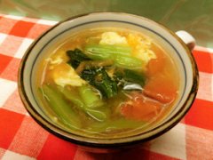 トマト・小松菜・卵のコンソメスープ♪ こってりな洋風献立に合うヘルシーで栄養価の高いコンソメスープです♪ トマト・小松菜・卵のコンソメスープ♪ 小松菜 水 トマト コンソ...