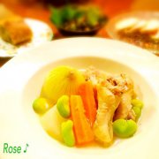 新玉葱と手羽元、空豆の春のポトフ 春野菜たっぷりの優しいポトフです! 材料 (4人分) 手羽元 8~12本 新玉葱 4個 大根 10㎝ にんじん 1.5本位 空豆 1袋 ブイヨンキューブ 2個 ローリ...