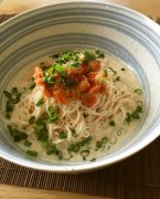 鶏ひき肉と白だしの冷たいかけ汁そうめん。