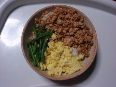 ご飯もの 小さい頃から母がよく作ってくれました。2歳の娘も気に入って食べてます。 材料 鳥ひき肉 300g 卵 3つ 野菜 インゲン・ほうれん草など緑の野菜適量 しょうが ひと...