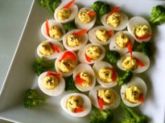 デビルズエッグ ほんのりカレー味。彩りも良くパーティにもお弁当にも使えます。 材料 ★玉子 10個 ★マヨネーズ 1/3カップ ★カレー粉 1 TSP 塩 適宜 万能ネギ または玉ねぎ...