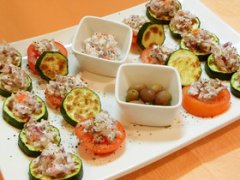 ズッキーニとオニオンクリームのオードブル 簡単オードブル 材料 (約6人分) ズッキーニ 1本 トマト 小玉 2個 又は 110g(うち10gはオニオンクリームで使用) 塩 2g(二つまみ) 油 大さじ...