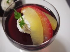 ワインゼリー 二色のリンゴの甘煮で、ちょっとおしゃれに仕上げました。 材料 (2人分~3人分) 赤ワイン 200cc 上白糖 20g 粉ゼラチン 5g りんご 1/2個 上白糖 5g ホ...