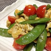 すなっぷえんどうとトマトの卵炒め 茹でずにフライパンで簡単に!シャキシャキ食感のあるカラフル卵炒め♪ 材料 スナップエンドウ 90g ミニトマト 5個 油(炒め用) 小さじ2 水(蒸...