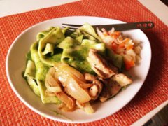 うどんカルボナーラ/ほうれん草ソース 帯うどんのパスタ風。パスタのように茹でないので簡単。緑はほうれん草と枝豆。ブロッコリーで代用可能。 材料 (一人分) 帯うどん 一袋...