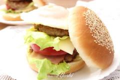 ボリュームたっぷり♡ ハンバーガー 具がたっぷり入った、ハンバーガーです♡ フォークとナイフを使って食べてね♪ 材料 (2人分) バンズ 2個 トマト 1/2個 レタス 1枚 卵...