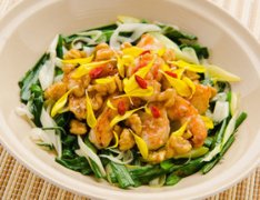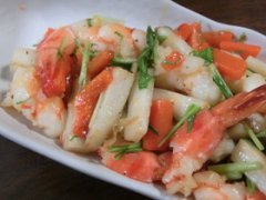 秋の薬膳:えび、くるみ、にら、長ねぎ炒め